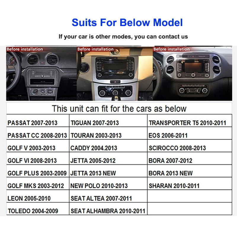 Installation Tips 1. Check there is no damage to the packing you received. 2. Check there is no damage on products. 3. Test functions before install into your car; use 12-14v power supply connect and check functions. 4. Check your car information carefully. If your car can't check from our page, it might not compatible, please don’t install it. For high allocation cars with canbus, you need to cut off the cables. 5. After installed, please check if it can turn off when your car turns off. if not, please contact us. NOTE: To make sure it can work well with your car, please try to make a test with our installation tips strictly.